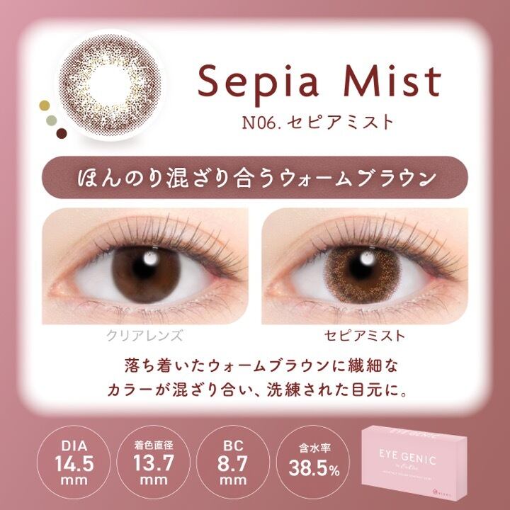 《セピアミスト》 “ほんのり混ざり合うウォームブラウン” 落ち着いたウォームブラウンに繊細なカラーが混ざり合い、 洗練された目元に。 イメージモデル:中野ゆいな 【ブランド名】エバーカラー 【販売名】アイジェニック 【内容】1箱1枚入り 【医療機器承認番号】22300BZX00162A45 【再使用可能な視力補正用色付コンタクトレンズ】 【使用期間】1ヶ月 【度数(PWR)】全25度数 【商品スペック】DIA 14.5mm/BC 8.7mm/含水率 38.5%/着色直径 13.7mm 【製造販売元】株式会社ANW 【販売元】株式会社アイセイ 使用上の注意 ●コンタクトレンズは高度管理医療機器です。眼科医にて診察を受け、指示を守ってください。 ●製品に添付されている添付文書をよく読み、正しい使い方を理解してからご使用ください。 ●装用スケジュールおよび装用時間を必ず守ってください。 ●正しい使用方法、ケア方法を順守してください。 ●目に異常を感じなくても、定期検査を必ず受診してください。 ●少しでも異常を感じたら、装用を中止し、すぐに眼科医の検査を受けてください。